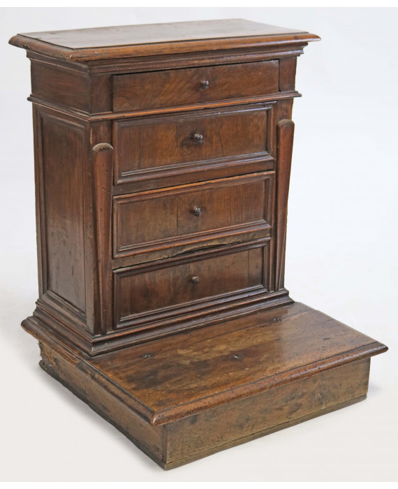Inginocchiatoio in legno di noce, quattro cassetti, piano inferiore apribile. Umbria, sec. XVII. cm80x64x58