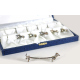 Lotto di sette oggetti in argento: una scatola a corpo liscio con interno in legno e bolli Londra, una statuina ed un centrotavola assenti di bolli, un piccolo centrotavola, una scatola con interno in vermeille ed un set di sei segnaposto a forma di cane, completo di custodia, con punzoni 800 ed un uccello con punzone 925. Peso tot., esclusa scatola con interno in legno, gr. 1100