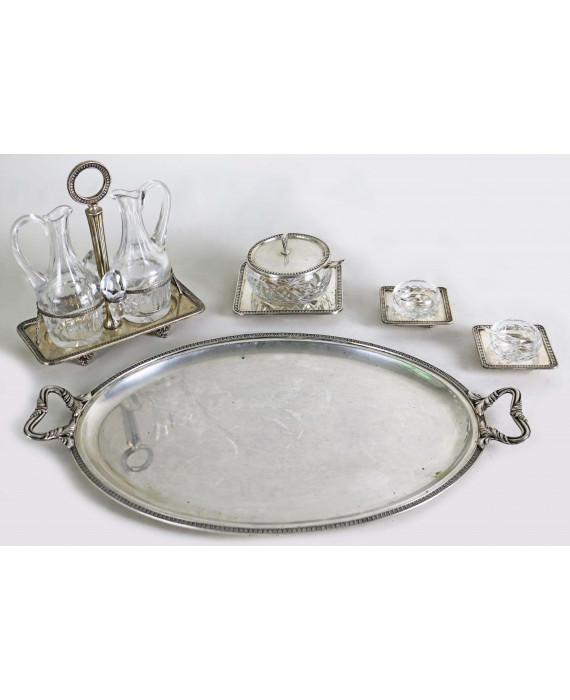 Servizio da tavola in argento 800 con decoro a palmette composto da un vassoio biansato, una oliera, una formaggiera e due saliere. Peso tot. gr. 1800