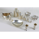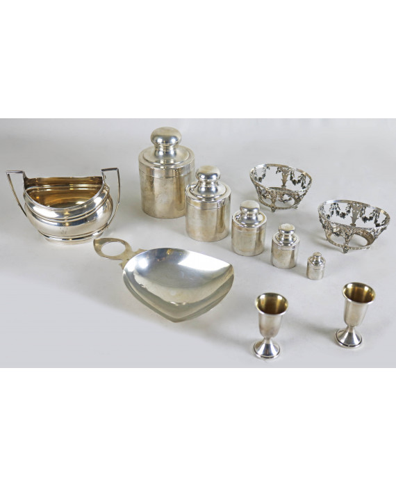 Lotto di sette oggetti in argento: un centrotavola biansato in argento con bolli Londra, una coppia di porta vaschette con bolli non identificati del sec. XIX lavorati con uccelli e serti floreali, un centrotavola ed un set di cinque contenitori a forma di pesi a matrioska, con bolli 800 ed una coppia di bicchierini in argento sterling. Peso tot. gr. 1220