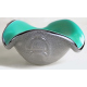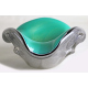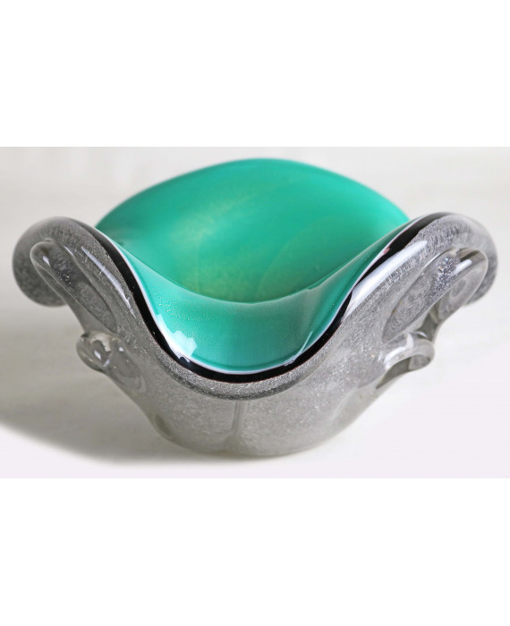 Ciotola in vetro verde incamiciato con inclusioni dorate, parte esterna in vetro bullicante. Murano, sec. XX. cm13x26x26
