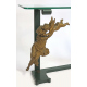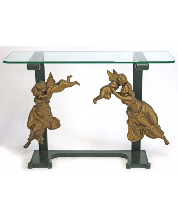 Consolle con struttura in metallo verniciato verde, decorata con due gruppi in bronzo dorato raffiguranti fanciulle con putti alati, piano in vetro. cm94x130x40