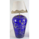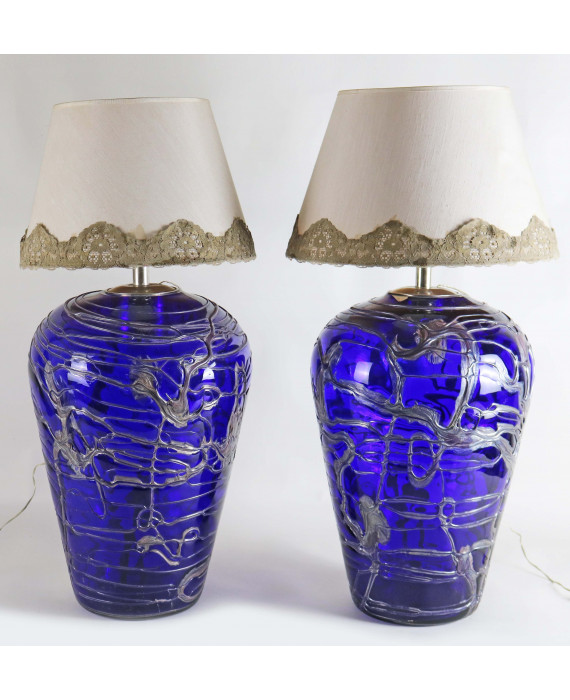 Coppia di grandi lampade da tavolo in vetro blu iridescente, con striature argentate, complete di paralumi in rivestiti in stoffa. Alt. cm50