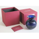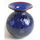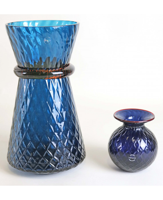 Lotto di un vaso modello Tiara, designer Francesco Lucchese per Venini, in vetro di Murano a fondo blu con anello arancione e un vaso modello Balloton, firmato Venini 2024, in vetro a fondo indaco con bodo rosso, con scatole originali. Alt. cm32/13