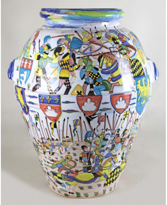 Orciolo in maiolica dipinta con scene di battaglie, fortezze turrite e blasoni nobiliari. Manifattura di Gubbio, sec. XX, firmato G.M. Alt. cm56