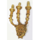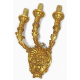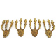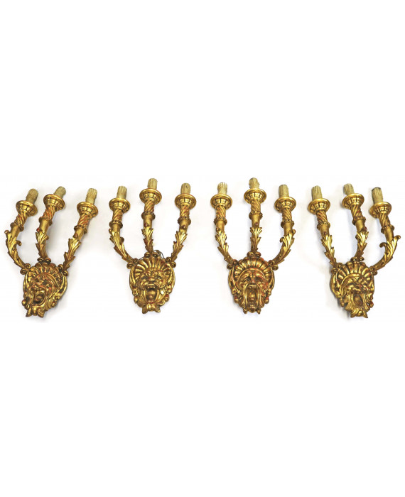 Serie di quattro applique a tre fiamme in legno dorato ed intagliato a volute vegetali e mascheroni centrali. Alt. cm55