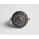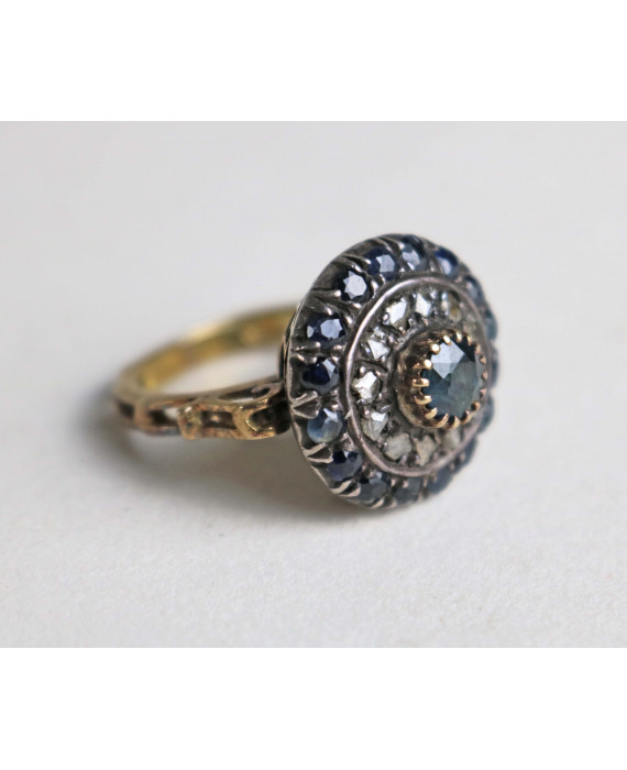 Anello in oro giallo 18Kt ed argento con diamanti e zaffiro tondo di circa 1 carato. Misura 13. Peso tot. gr. 7,7. Allegata dichiarazione di autenticità a cura della gioielleria Ci&Ci