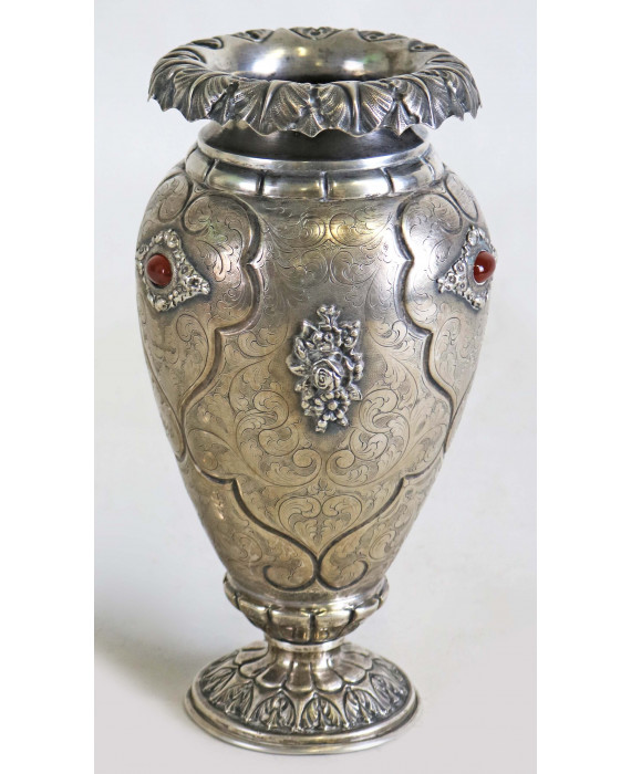 Vaso in argento 800 inciso e lavorato a volute vegetali e serti floreali. Peso tot. gr. 670