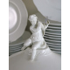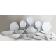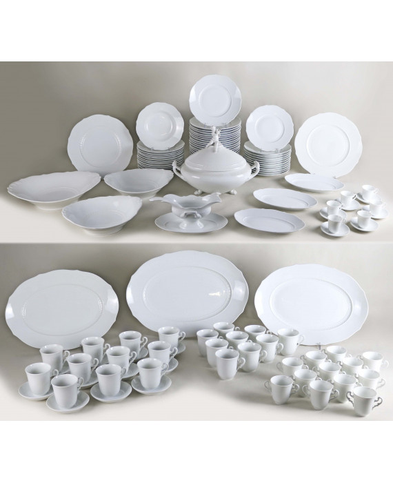 Elegante servito in porcellana bianca marcata sul fondo Richard Ginori, modello Museo, composto da 24 piatti piani, 13 piatti fondi, 12 piattini, una zuppiera con coperchio e pomolo a putto, tre insalatiere, una salsiera con mestolo, tre antipastiere, cinque piatti da portata, 12 tazze da consommé, 18 tazze con undici piattini e sei tazzine da caffè con piattino (piccolo restauro ad un piatto si servizio)