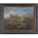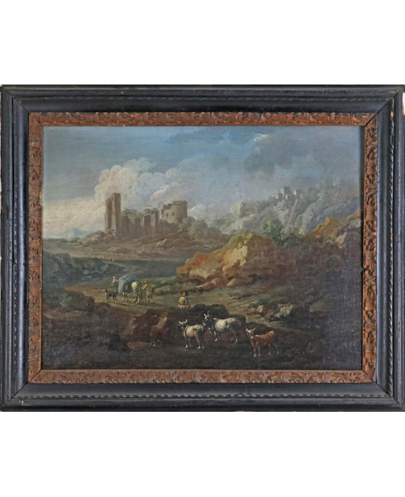 Paesaggio con rovine e armenti, con cornice. L’opera è da riferire al pittore Cajetan Roos che, insieme al fratello Jacob, detto Rosa da Napoli (1682 - notizie fino al 1730), si dedicò alla rappresentazione di scene bucoliche, proseguendo la tradizione pittorica del padre Philipp Peter, noto come Rosa da Tivoli. La produzione di Cajetan Roos, tuttavia, si distingue per una diversa sensibilità e per un più marcato interesse per la rappresentazione paesaggistica, dove inserisce elementi rovinistici
