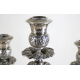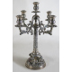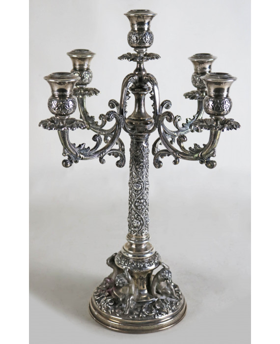 Candelabro a cinque fiamme in argento 900 lavorato ed inciso con serti floreali, bracci a volute vegetali, base circolare con quattro putti che sostengono in fusto centrale. Alt. cm51. Peso gr. 2925