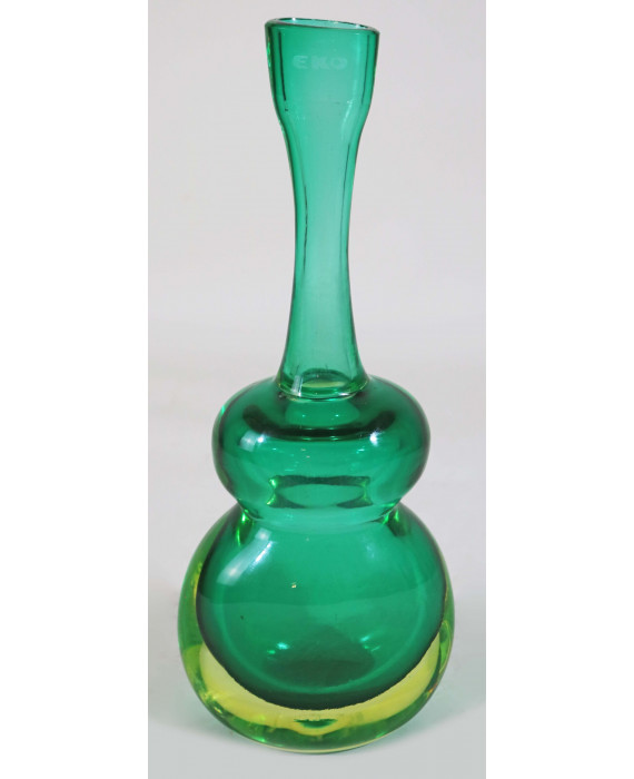 Flavio Poli (1900-1984). Vaso pubblicitario in vetro sommerso nei toni dell'azzurro, realizzato per il produttore di chitarre Eko. Anni '60. Alt. cm35