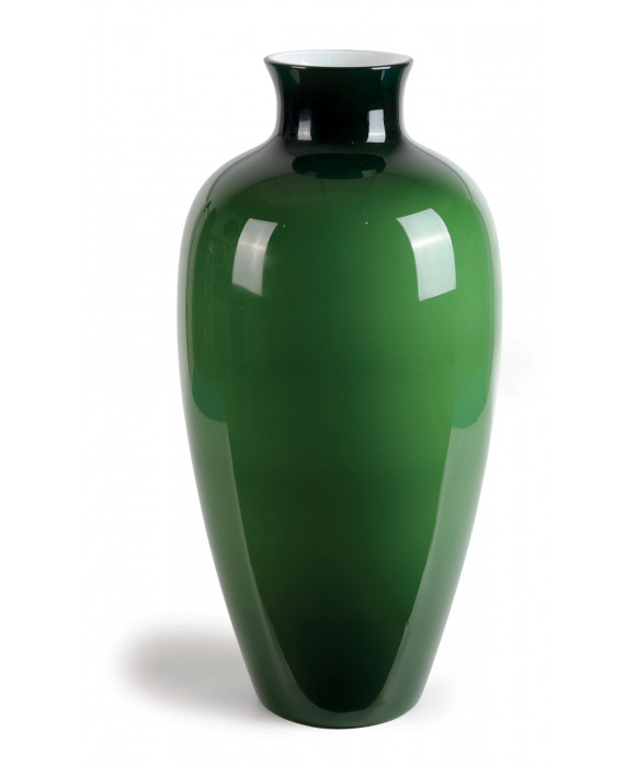 Grande vaso modello Labuan in vetro di Murano incamiciato a fondo verde, firmato sul fondo Venini 86. Alt. cm63