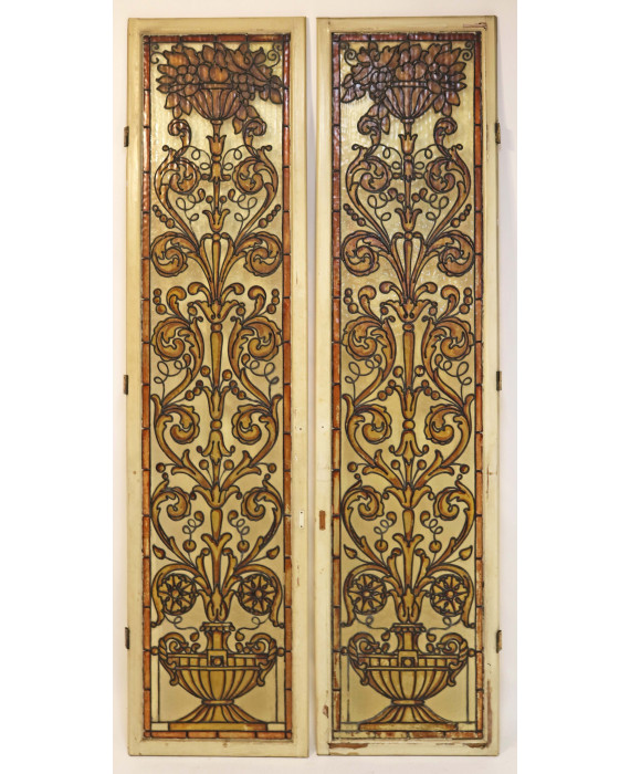 Coppia di ante in vetro piombato, lavorate a volute. cm186x40