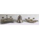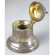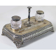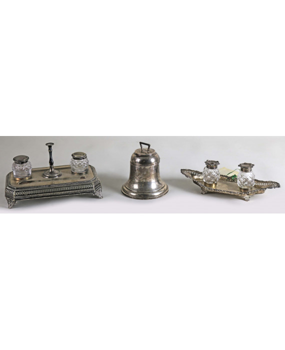 Lotto di tre calamai in argento inglese: uno con due vaschette in vetro con bolli Londra 1902, uno a forma di campana con iscrizioni incise ed uno con bordo traforato e due vaschette in vetro con bolli Londra. Peso tot. dell'argento gr. 960 (ammaccature alla base di uno)