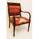 Lotto di un tavolinetto tondo impiallacciato in legno di mogano, un cassetto, applicazioni in bronzo dorato, tre sostegni piramidali raccordati da pianetto inferiore, piano in marmo ed una poltrona in legno di mogano con applicazioni in metallo dorato e seduta e spalliera rivestite in stoffa. Alt. cm72; diam. cm56 (rotture e mancanze alla stoffa della poltrona)