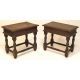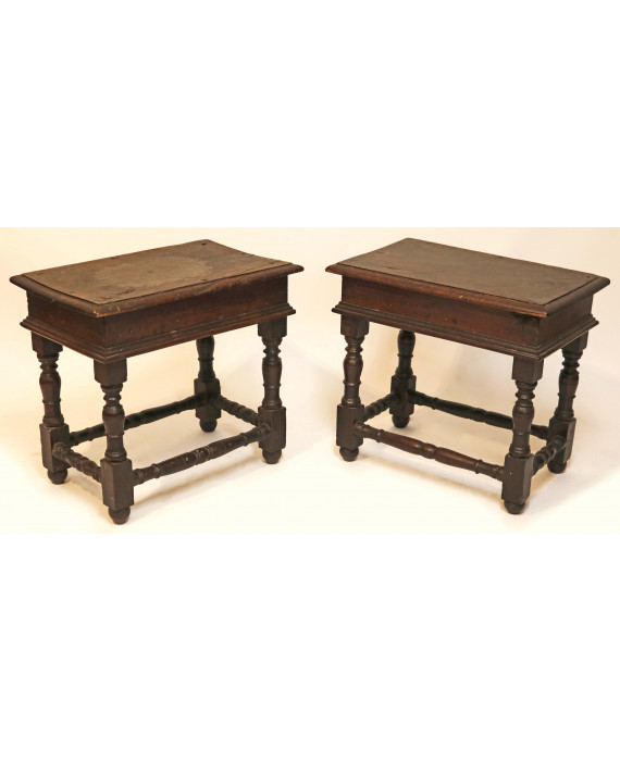 Coppia di tavolinetti in legno di noce con quattro sostegni e traverse torniti a rocchetto. Italia centrale, sec. XVII. cm55x50x38