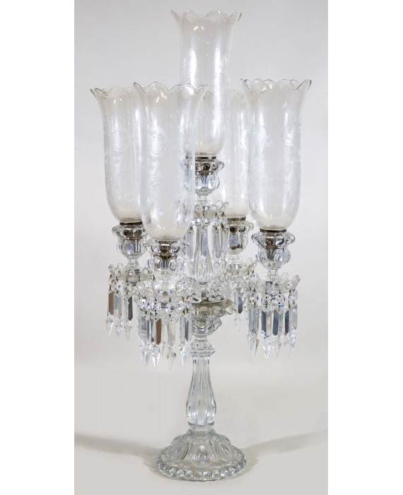 Flambeau a cinque fiamme in cristallo marcato Baccarat con bobeches incise a volute. Alt. cm80