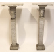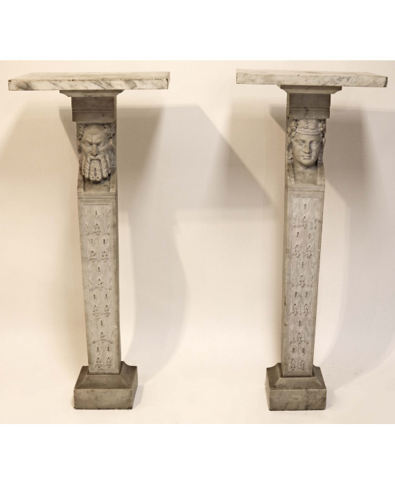 Coppia di lesene in marmo bianco scolpite con testa di telamone e cariatide, piani rettangolari. cm 107x44x35; cm102x43x35 (scheggiature)