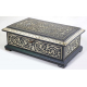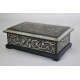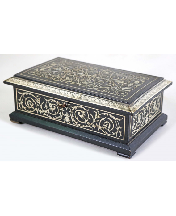 Ferdinando Pogliani (1833-1899). Scrigno da tavolo in legno ebanizzato, intarsiato in osso con volute, girali e mascheroni. Sul fondo timbro impresso Ferd. Pogliani ebanista Milano. cm10x25x16