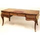 Elegante scrivania lastronata in bois de violette, con riquadro in radica di pioppo intarsiato in madreperla con serti floreali, cinque cassetti, applicazioni in legno dorato. Manifattura Laboratorio d'ebanisteria Cavaler Adriano e Fabio (cartiglio pirografato sul fianco laterale di un cassetto). cm80x178x77 (alcune mancanze ai fregi dorati)