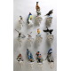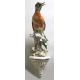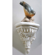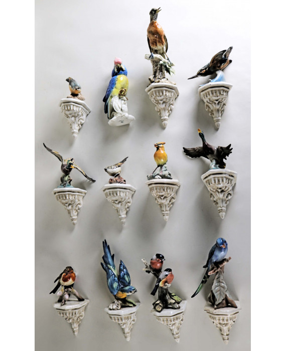 Lotto di dodici uccelli in ceramica e porcellana policroma di diversa manifattura, di cui undici su mensola in ceramica bianca (piccole mancanze e restauro ad uno)