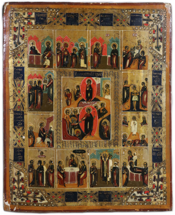 Icona a fondo oro e tempera raffigurante le Dodici Grandi Feste. Russia sec. XIX. cm31x25