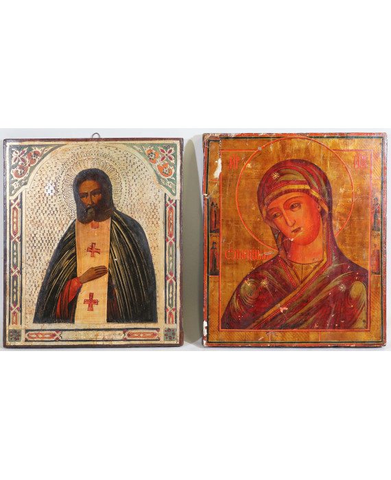 Lotto di due icone: Vergine. Tempera su tavola con fondo a foglia oro. Area post-bizantina sec. XIX. cm35,5x30. San Serafino di Sarov. Icona a tempera su tavola con fondo a foglia oro a mecca. Russia sec. XIX. cm35x30 (lievi difetti perimetrali)