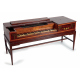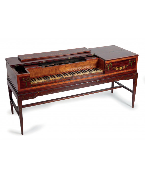 Pianoforte in legno di mogano interamente dipinto con serti floreali, nastri, e ovale centrale con amorini e caprone, poggiante su base con sostegni piramidali, fascia centrale in acero con iscrizione Jacobus Ball fecit Duke Street Grosvenor Square London. Inghilterra, inizi sec. XIX. cm77x159x58 (alcuni tasti mancanti e meccanismo da restaurare)