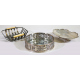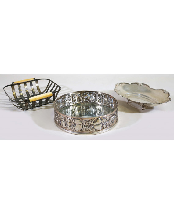 Lotto di tre centrotavola in argento 800 di cui uno con manici in osso ed uno marcato Brandimarte. Peso tot. gr. 685
