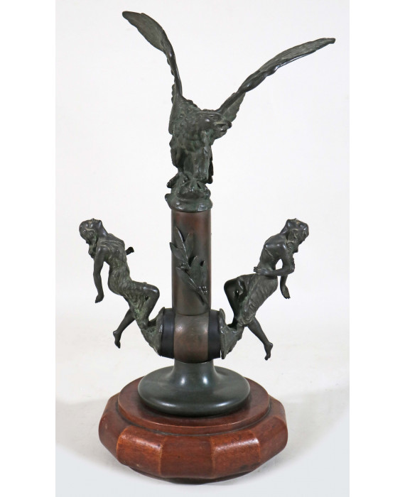 Gruppo in bronzo e legno raffigurante aquila con figure classiche e rami di quercia su base in legno. In basso due iscrizioni Proprietà artistica tip F.B.A. Italia, inizi del sec. XX. Alt. cm51