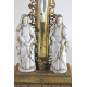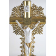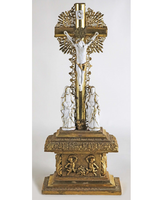 Crocifisso su base in legno e stucco dorato, con Cristo e due figure femminili in biscuit. Italia, sec. XIX. Alt. cm54 (alcune mancanze e restauri)