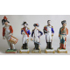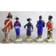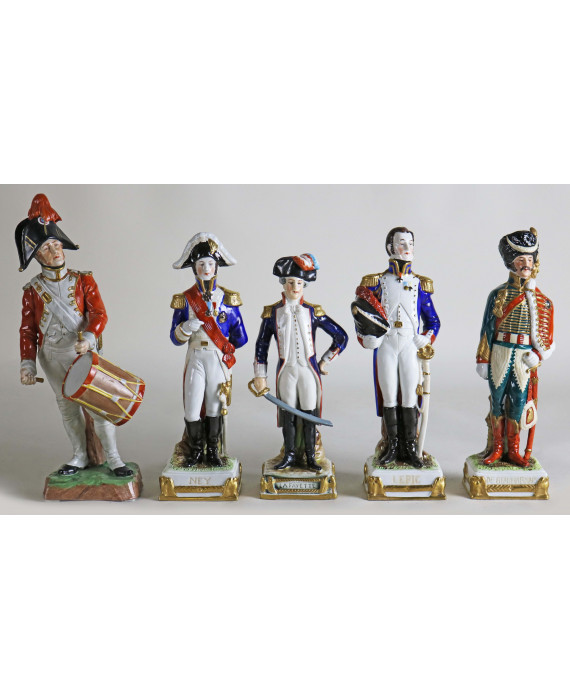 Lotto di cinque statuine in porcellana policroma raffiguranti soldati napoleonici, tra cui una marcata sul fondo Dresden. Alt. cm28/25(3)/23 (piccola mancanza ad una)