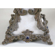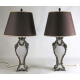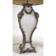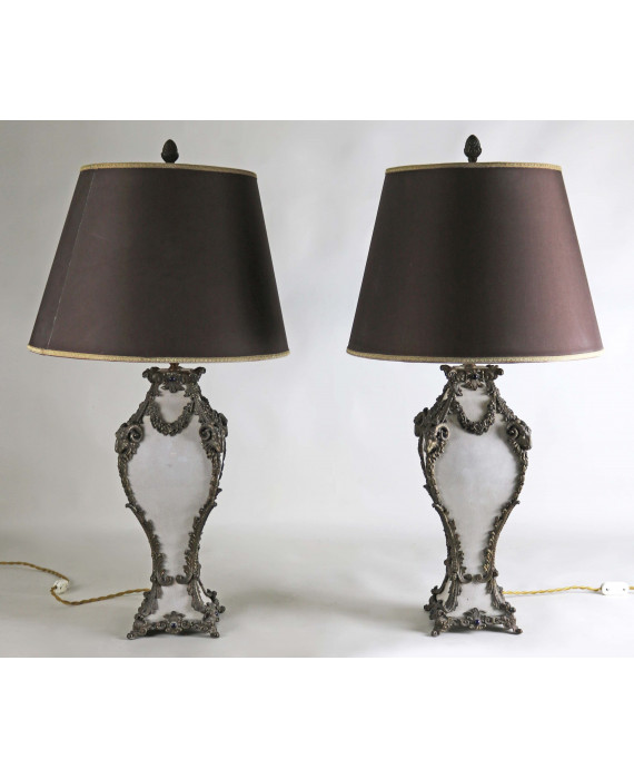 Coppia di lampade da tavolo in porcellana a fondo bianco decorate in bronzo patinato con volute vegetali e teste di ariete, con paralumi. Alt. cm46