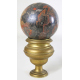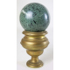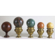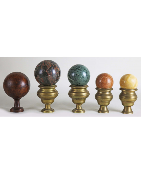 Lotto di cinque sfere di cui una in radica con supporto in legno e quattro in marmo con supporti in bronzo tornito. Alt. cm22/20(2)/19(2)