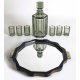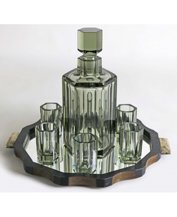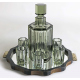 Lotto di un servizio da rosolio in vetro fumè composto da una bottiglia con tappo e sei bicchierini ed un vassoio a fondo specchio con anse rivestite in argento 800 del periodo del fascismo. (usure del tempo al vassoio)