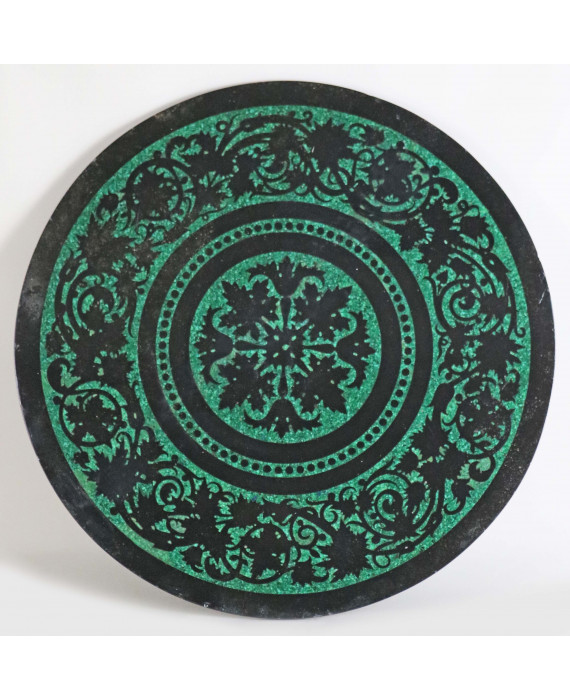 Piano tondo in lavagna decorato a volute vegetali in scagliola a fondo malachite. Diam. cm50 (lievi scheggiature)