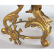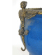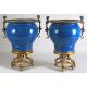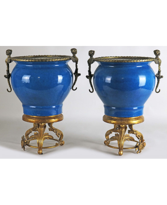 Coppia di cachepot in porcellana a fondo blu, anse a cariatidi e base a volute vegetali, in bronzo dorato. Alt. cm45 (piccole mancanze)
