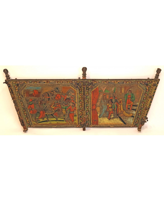 Sponda di carretto siciliano in legno intagliato e dipinto con scene cavalleresche. Italia, sec. XIX. cm140x59x10