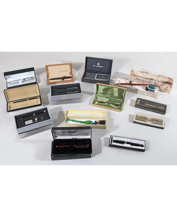 Lotto di 15 penne a sfera e stilografiche, tra cui alcune di marca Aurora, Parker e Nazareno Gabrielli