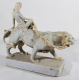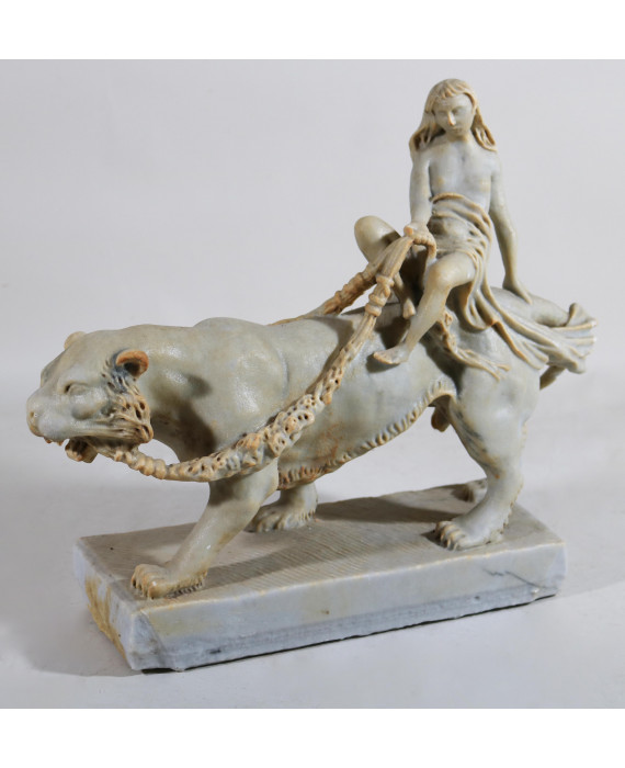 Scultura in pasta di marmo raffigurante fanciulla che cavalca una tigre. cm38x45x14 (lievi scheggiature e restauro alla coda)