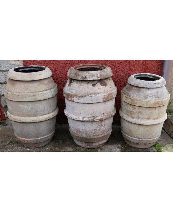 Lotto di tre orci in terracotta, tra cui uno firmato Benocci Febo Petroio. Alt. cm66/65/60