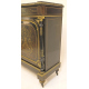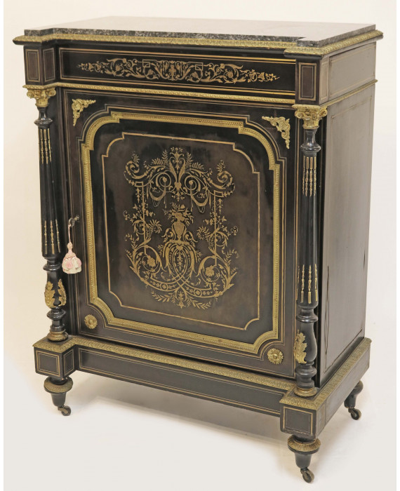 Credenza ad uno sportello in legno ebanizzato intarsiata con fili in metallo con festoni e serti floreali, applicazioni in bronzo, colonnine laterali, piano in marmo. Francia, sec. XIX. cm117x89x46 (lievi difetti)