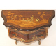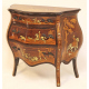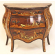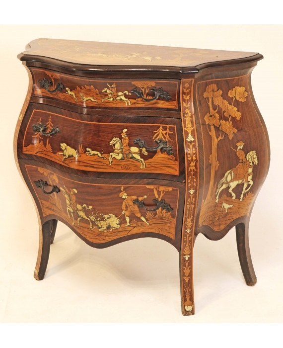Comò impiallacciato in legno di palissandro ed interamente intarsiato in legni chiari con scene di caccia e serti vegetali, tre cassetti, fronte e laterali mossi. Italia, sec. XX. cm87x98x43