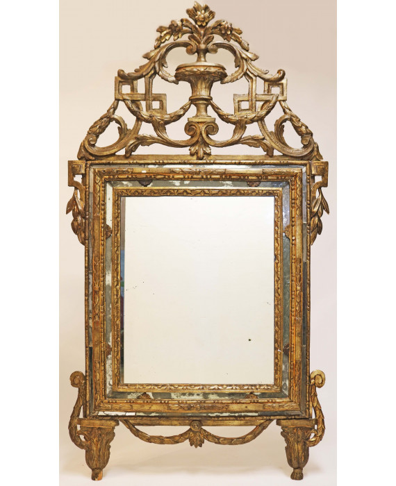 Specchiera in legno laccato, dorato ed intagliato a volute vegetali e fiori. Italia, sec. XIX. cm170x93 (piccole mancanze)