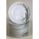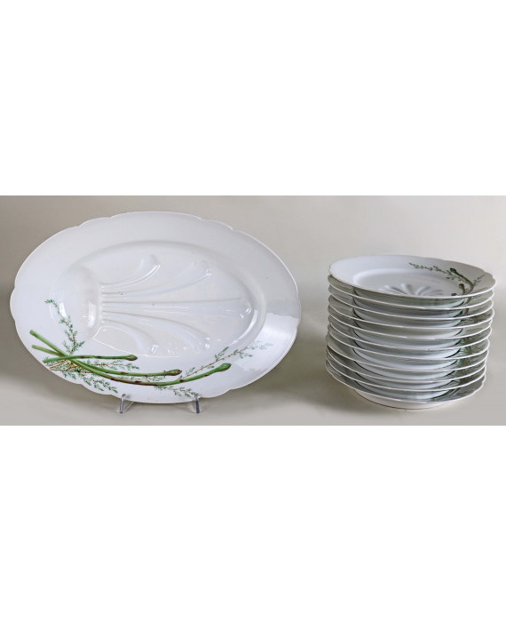 Servizio di piatti per asparagi in porcellana bianca dipinta in policromia marcata Ginori in verde composto da 11 piatti ed un vassoio ovale. (lieve abrasone al vassoio)