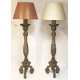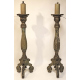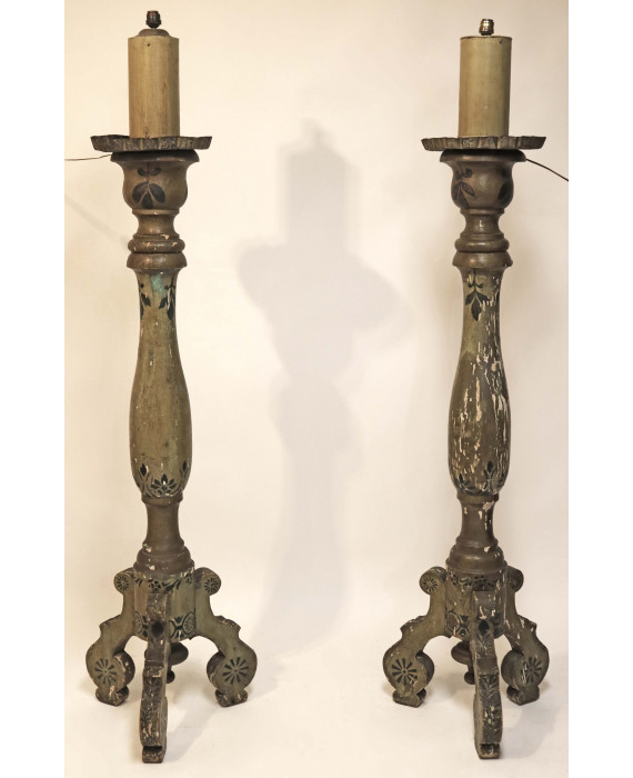 Coppia di torcieri da terra in legno laccato e dipinto con serti vegetali, base atripode. Italia, sec. XIX. Alt. cm150 (mancanze alla laccatura)