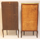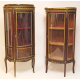 Lotto di due vetrine a uno sportello con applicazioni in bronzo dorato: una impiallacciata in legno di palissandro con riquadri raffiguranti scene galanti e paesaggi, l'altra impiallacciata in legno di mogano con piano superiore in marmo e ringhierina. cm145x68x32; cm140x69x33 (lievi difetti)
