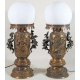 Coppia di lampade da tavolo con corpo in bronzo interamente lavorato con serti floreali, rami di frutta ed uccelli. Giappone, periodo Meiji, fine sec. XIX. Alt. cm66