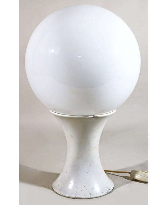 Lampada da tavolo con base in metallo bianco e paralume in vetro lattimo. Produzione Stilnovo, anni '60. Alt. cm50 (usure del tempo)
